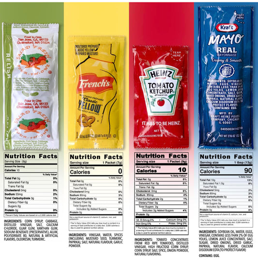 50 Single Serve Pouches of Each: Ketchup, Mustard, Relish, and Mayo (200 Condiment Packets Total)